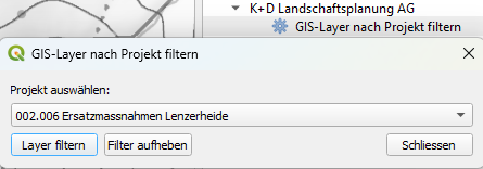 Ebenfalls niederschwellig ist die Möglichkeit zur Generierung zusätzlicher Verarbeitunswerkzeuge (Processing Tools) in einem vorgefertigten Template. Dieses erlaubte uns, mit ein paar Zeilen eingebettetem Python-Code eine einfache dynamische Filterfunktion in einem Pop-Up-Fenster zu kreieren. Die Anwenderin muss lediglich das gewünschte Projekt auswählen und alle enthaltenen Layer und Views werden automatisch korrekt gefiltert.